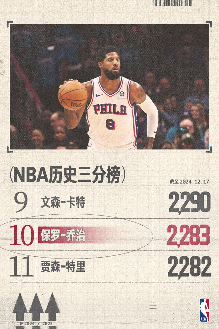 76人球星保罗-乔治在上半场比赛命中了4记三分球,据统计,乔治的生涯三分球总命中数来到2283记,超越贾森-特里(2282)升至历史第十位。